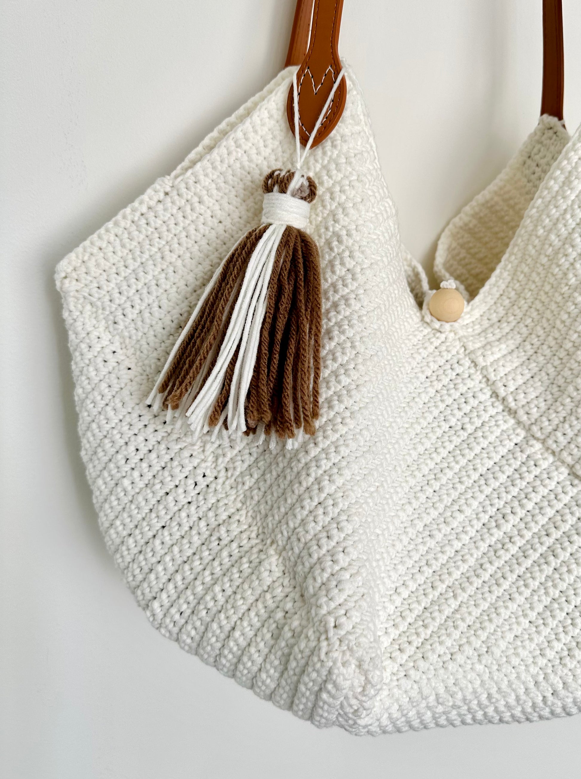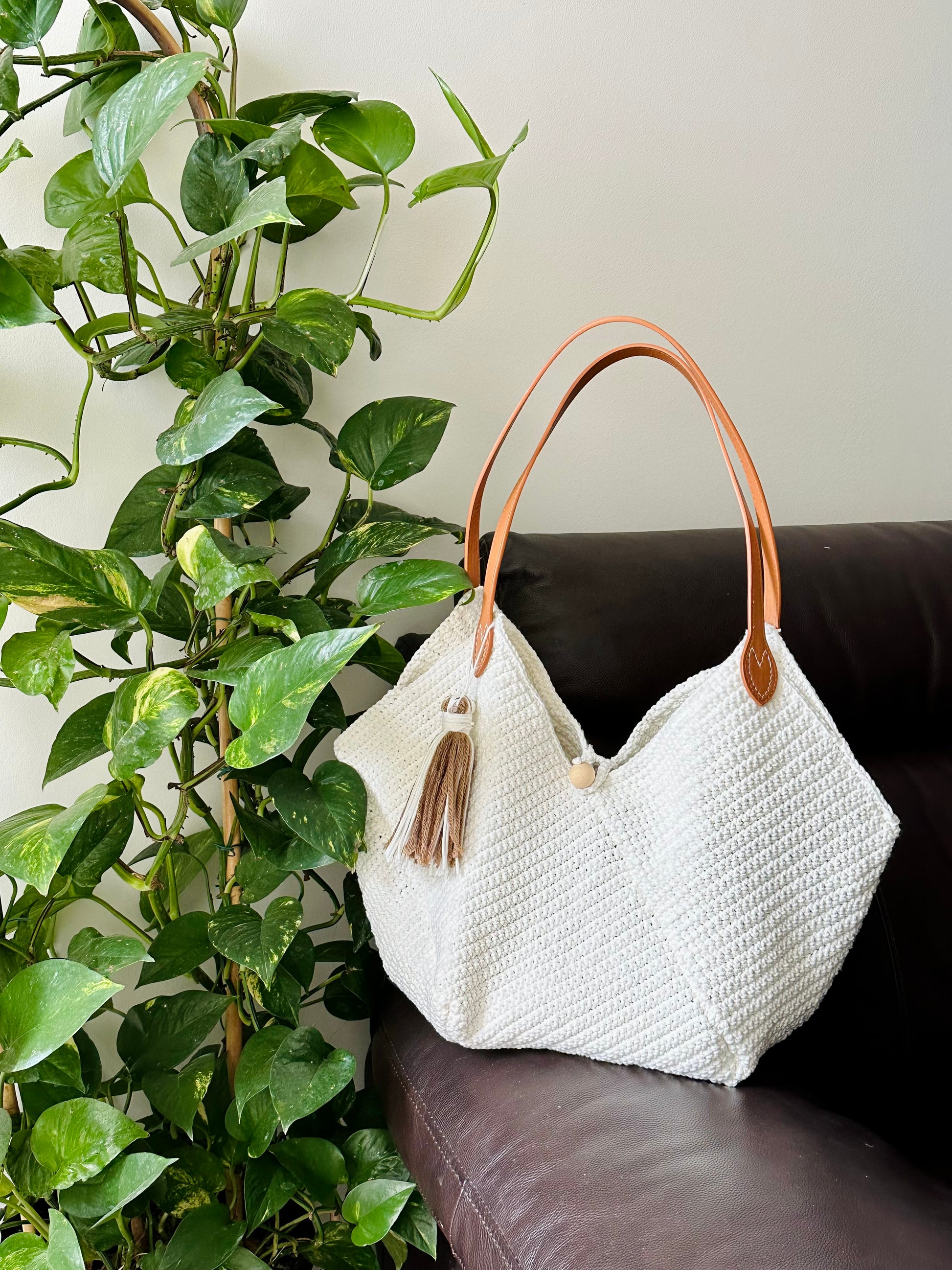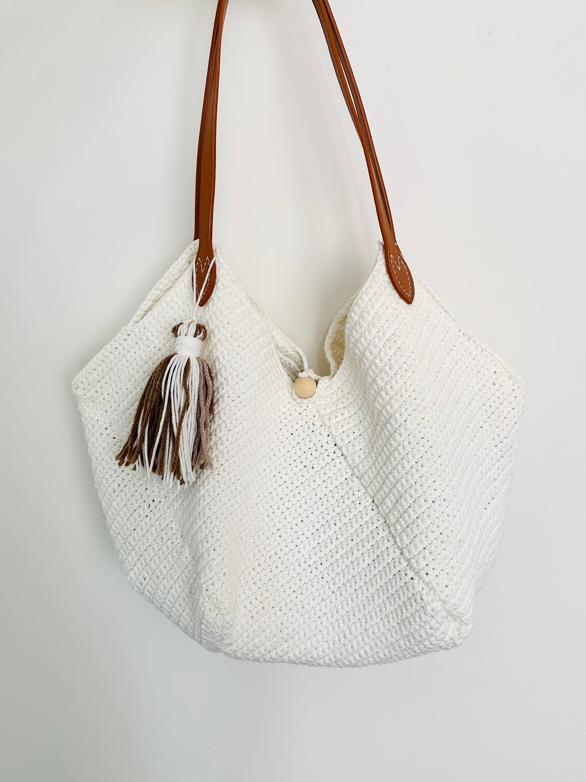 This white crochet handbag is 100% hand - crocheted with a tassel and leather straps. Perfect to carry on your shoulder or hand held as a tote!Â