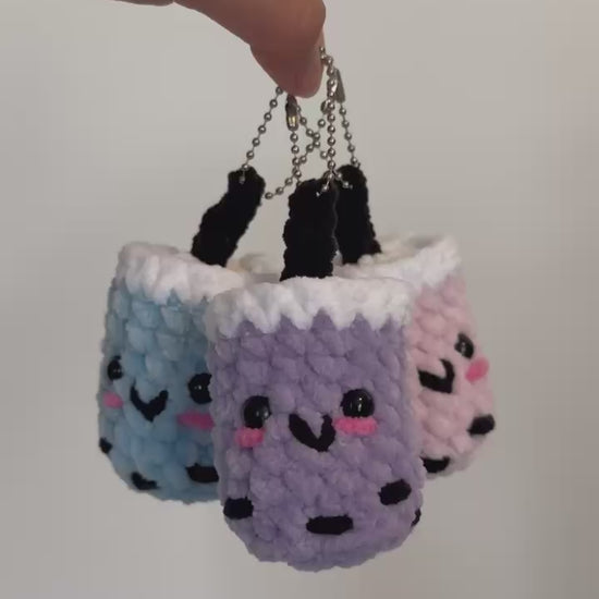 This is a downloadable PDF pattern for a crochet boba keychain by Artisan Gift Collection.